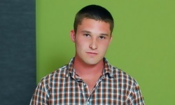 Joshua Crown stands almost six feet tall and reminds us very much of a farm boy, both in his appearance and his aww-shucks attitude. There is definitely something very sexy about Joshua, beginning with his smile. He has a flirtatious way of looking at you, and you are not quite sure what he is thinking. Thankfully for us, he is thinking about getting off! Joshua takes off his clothes slowly, revealing finally nice hairy legs, a football build, and a nice uncut cock. Joshua works it up quietly, tugging at his balls and playing around with his foreskin. Once Joshua is into it, he hops on the bed to continue. Closing his eyes we can imagine that he is thinking about getting some great head from the way his is jerking himself. Joshua lies down and continues to play with his cock and balls, resting comfortably with one hand behind his head. He seems very comfortable jerking it on camera, and when he decides he is close he looks right into the lense. Jerking it wildly toward the end, he cums - jizz spurts out and drips all over his stomach, hand, and cock head as a broad smile once again crosses his face. Hot stuff!