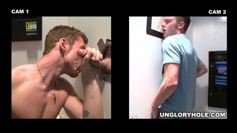 This kid is gun ho about getting his dick sucked. He acts like he's done this before. The glory hole doesn't phase him. He barely meets us before he's back in the room. And he's not bashful, as soon as he sees Alexis's tits he shoves his cock through the hole, and gets a blowojob that blows his mind. He shoots his big load over some guys face and is none the wiser. When he walks out he's ranting on and on about how good this "chick" sucked his dick. He really had no idea. Well I guess he will now.