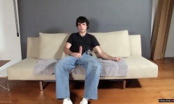 He shows off his big fat cock head and rock hard shaft as he gazes into the camera with dreamy brown eyes. Begging the camera to satisfy his horny desires! He strips naked to reveal his hairy chest as he relaxes on the couch and works his rock hard cock until he sprays a huge load of cum all over his furry belly!