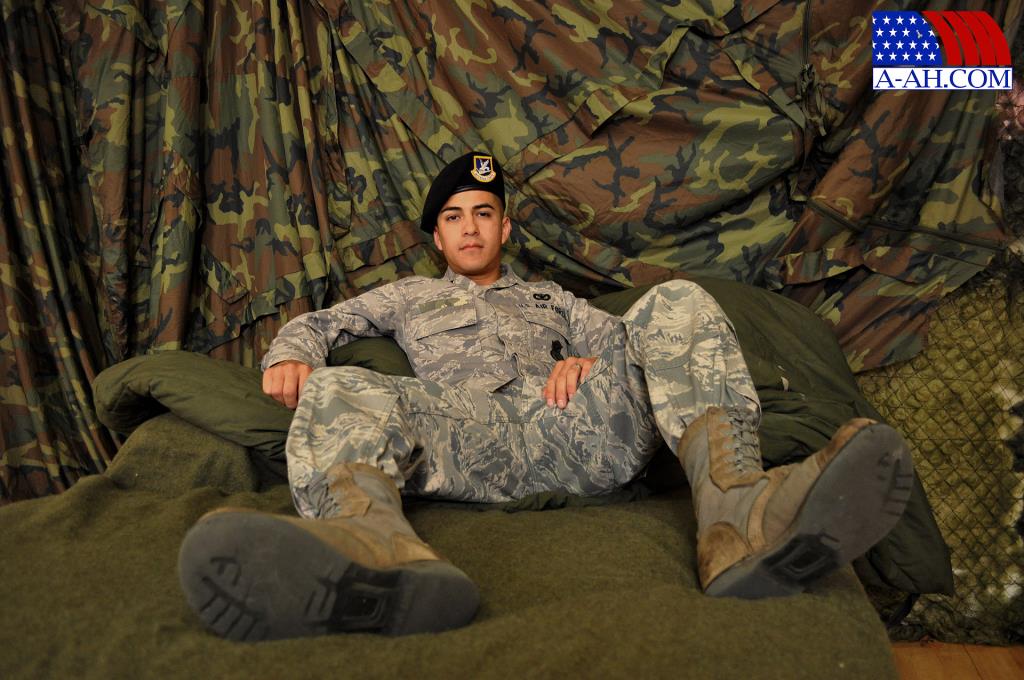 Paolo is a young latino stud who has a slightly more worldly view than most of the men at All American Heroes. His parents immigrated from Mexico, his grandparents from Italy and Paolo has traveled the globe since he was a boy. When asked why he joined the Air Force, he simply stated that he thought that everyone should serve their country at least once in their lives. Paolo loves the freedom that being an American provides so much, he joined the military to protect those liberties. This honorable young man was deployed to Saudi Arabia and several other countries before he came home. Back on base he is an MP, law enforcement and security are his duties and he takes his job very seriously. Paolo is dark and handsome with just the right amount of baby fat still on his cheeks, betraying his young age. He looks very handsome in his uniform but can't wait to peel it off. Paolo removes his uniform jacket and shirt to expose his caramel colored, smooth skin speckled with dark tattoos.