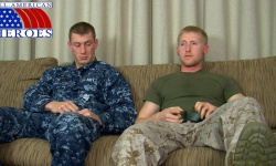 Petty Officer Aiden is a newbie to the Navy. Tall, handsome, and still a little wet behind the ears, Aiden has already decided he is going to be a lifer in the service. Strapping young Jay has a few more years of service under his belt and is more than willing to show Aiden the ropes. Jay enjoys the company of fresh meat and the two swap stories from boot camp and a few more personal experiences. Aiden's claim to fame is that he banged Miss California at a party in northern California once. Jay is intrigued by this tale and wants to see who gives the better blowjob, him or Miss California. The young soldiers get their cocks in hand and start to reprimand them underneath their cammies. Jay leans over and takes Aiden's thick meat sword into his throat. Jay bobs up and down on Aiden's big uncut dick getting it rock hard in seconds. He pulls off Aiden's uniform and exposes his muscular chest and stunning Navy tattoos. Jay offers up his own cock for a little reciprocation and Aiden goes right for it. Aiden hits his cock sucking stride quickly and brings Jay to the brink. Jay launches a big white wad all over Aiden's soft cheek. Rope after rope of semen squirts from the pink head with seemingly no end. Relieved of his load, Jay leans down to finish the job he started with young Aiden's rod. Aiden blows his own prize into Jay's wet hungry mouth.