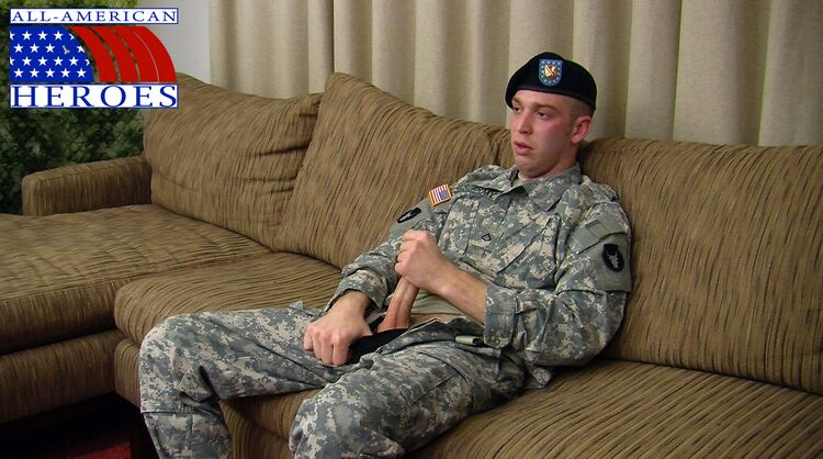 Axel works in the Minnesota National Guard. He helps make sure the tanks and trucks have fuel to do their missions. He joined the guard for the glory, and a chance to serve his country. He hopes some day his unit gets called to the front lines. That's what he's there to do. His light green digital camouflage appear to be holding back some tight muscles and military studliness as he starts to work on his tool. He whips it out of his fly and begins stroking his little soldier. Ready to settle in, he takes off his shirt. His slightly furry chest swells with each stroke and the tattoos seem to dance with the movement of his arm. Leaning forward against the back of the couch, this sexy soldier starts to play with his hairy little ass. First, he just grabs his ass cheek with one hand, spreading open his crack for the world to see. But then he starts to jam his ring finger in all the way to the third knuckle. Sitting back down, his chest is flushed and it looks like he's ready to blow. His cock is at full salute and he's moaning slightly. Gripping tightly, his cock chokes out several large clusters of jizz as his chest heaves.