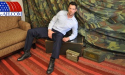Senior Airman Zach served several tours of duty in Iraq and Afghanistan. He was ground support in the Air Force where he had to pull out his weapons to ward off the bad guys a few times. As he tells his stories of war, his uniform is stretched to the limit by the bulging muscles beneath. His crystal blue eyes have the look of a man who is ready to serve his country at a moment's notice. As his attention turns to the video he's been given to watch, the crotch of the dark blue pants begins to swell. He rubs at the bulge from outside the trousers before shoving his hand underneath. As the heat in the room increases, he unbuttons his shirt and pulls up his white t shirt, revealing rippled abs and a well developed chest. When he removes them completely, a tattoo rings his left bicep, which grows with each caress of his chest and cock.
