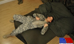 Ben was so eager to serve his country, he signed up and went through basic training during his junior year of high school. After high school he immediately went into the service and became an exemplary soldier. His fair skin, blue eyes, and modest demeanor illustrate his midwestern upbringing. As he grabs his cock through the camouflage, his gaze is fixed upon the television screen. When he unbuttons his pants, a stiff cock springs to life, surrounded by a thick black bush. The hair around his cock leads upward to a large patch on his stomach and an even smaller patch on his chest. His chest is adorned with a tattoo of the mascot from his favorite college football team. He rises to his knees and continues stroking, giving a perfect view of his rounded, fur covered ass cheeks. As he arches his back, he reaches behind and begins to finger his hole, circling his middle finger around the hair lined entrance. Every so often, as he strokes his cock, he lets go, allowing it to spring to full attention. As he flops onto his stomach, his chest becomes flush. He begins to sigh and a glob of white jizz wells up at the tip of his dick. His stomach heaves and several more puddles of semen well up on the fur patch below.