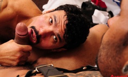 A Classic remastered in HD, featuring two of our all time most popular models, Jean Franko and Lucio Saints. Black leather looks amazing on Lucio's smooth muscular body. Jean Franko chooses a much simpler cock ring but when you are Jean Franko that's all you need. Lucio returns the favour and handles JF's lunchbox with gusto and while he is there extends the fondling to JF's masculine ass. They take turns sucking each other off but Lucio soon develops a taste for his hunky friend's ass. Wouldn't you? He bends him over and starts working that hairy hole with tongue, fingers and some beads which are soon replaced by Lucio's massive cock. He wants to sit on it and it takes some time for JF to be able to slide over that meat totem but he finally succeeds and his nearly virgin ass gets a royal fucking and a royal wetting when Lucio squirts an enormous amount of cum over Jean Franko's. South American dream.