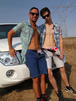 I'm really excited to write to you today to tell you about our road trip through the countryside of Victoria with my mates Zac, Lincoln, Ryan and Diego. We were heading out on a mission to find some new places to do some outdoor shoots. Well we did find some great places out in amongst the farming land and up in the higher mountain ranges. Then Ryan and Diego (who had been fooling around in the back of the car) decided to give us a bit of a show. So we all jumped out and set it up as a hitch hiking scene. Ryan Anderson was the lonely hitch hiker about to be picked up by our hot top Diego Sanchez. You might remember Diego from a couple of years ago making some very hot scenes with my other mates on BentleyRace. And today he didn't let us down. He was about to drill Ryan from every position possible! And I can see that Ryan was enjoying all the attention too! Even Lincoln helped out with the filming of this scene. Usually he prefers to be in front of the camera. So now that we've found some great outdoor spots to shoot in the BentleyRace mobile porn studio will be getting out and about much more in the great Australian outdoors.