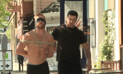 In the heart of the Castro here in San Francisco, Trenton Ducati walks his bound and blindfolded stud, Christopher Daniels down Market street. They find a local clothing store and head on inside with Christopher on display up front. Trenton asks the manager if it's alright for them to have some fun in the store and tape it for their home movies. With the manager's approval, Trenton whores out his bound stud to the crowd, bending him over as they each line up to eat out his ass. Christopher's dragged around the store servicing everyone anyway they see fit. As the greedy whore licks their boots and swallows their cocks, the crowd bends him over and takes turns fucking his slutty hole. After stuffing him full of cock, the guys line up and reward Christopher with load after load of cum dripping down his eager face.