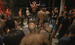 Over a hundred horny men show up for our Pre-Dore Alley Party to kick off the weekend and hot southern stud Jordan Foster is the main attraction. Jordan is completely blindfolded as we pass him around for everyone to grope. He's so aroused from all the attention that the guys notice his pre-cum already soaking through his underwear. The crowd gets busy and starts tearing away his clothes. After Jordan's beaten red with the flogger we have him crawling on his hands and knees, whipping out as many cocks as he can find. The crowd shoves three cocks in his mouth as his ass gets fucked for the whole party to see. Bound on a net of chains, Jordan screams in pain as clothespins are attached all over his body before having every single one smacked off with the crop. With his body sore from the clothespins, the whole party jumps up and rubs a million hands all over him, giving him the mixture of pain and pleasure. After the guys take turns fucking his hole to the sounds of the cheering crowd, everyone lines up their cocks to cover the greedy whore with their loads. Cum dripping down his face, Jordan crawls to the back room where the party's just getting started.