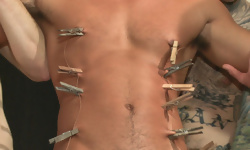 Blindfolded and crawling on his knees, cock whore Seth Santoro shoves his face into horny dudes crotches as he's flogged from behind. The guys shove dicks on sticks in both of his holes, prying him open to double penetrate his perfect ass until he's ready for the real thing. Seth's tied down on the table as the crowd runs a train on him, handgagging his mouth to shut him the fuck up. When he begs for mercy that only gets the crowd going more, they quickly ram their hard cocks up his ass before giving him a nice bukkake with cum dripping all over his face. One last surprise with clothespins down his torso has Seth screaming at the top of his lungs while all the crowd can do is laugh at the whore's expense.