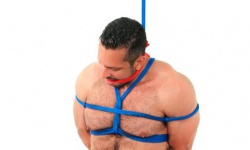 Super hairy and muscular bound jock Adam Champ is tied to a stool in his briefs and bandana gagged. Unable to get free his tormenters then remove his briefs and tie his hands high above his head to the ceiling. His massive uncut cock is tied to the base of the stool. As he struggles, the tension on his cock and balls gets him super excited and rock hard. The harder he struggles the harder he gets until he can’t take it anymore and blows an impressive load!