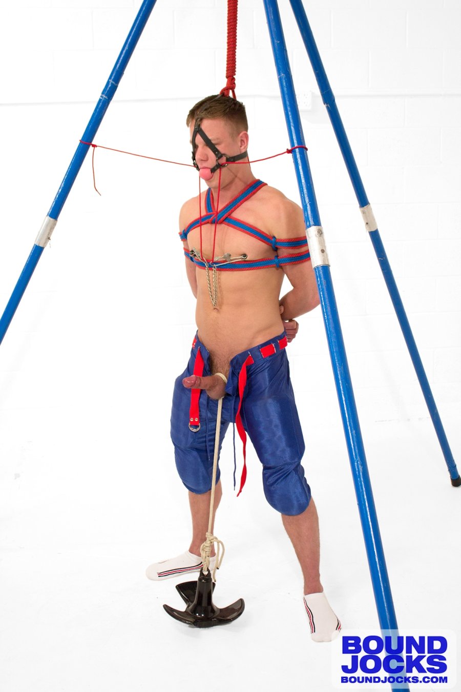 Bound, athletic jock Joseph Rough has been strung up after practice shirtless and in his football pants. His hard nipples are clamped and carefully strung to his head harness bit gag so that every time he moves his head he also tugs on his nipples. His balls are stretched to an anchor in the floor. Armond Rizzo takes great pleasure in the football player’s predicament and tugs, twists and slaps the quarterback until he groans in agony. Armond removes the nasty clamps for a second and replaces them with vibrating ones. This makes the jock harder as Armond continues to torment his hot captive!
