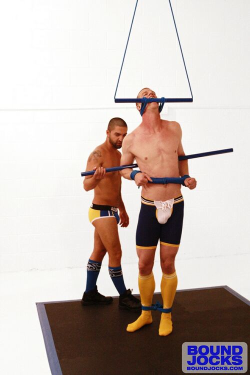 Blake Daniels is helplessly tethered by his mouth in the middle of the room with a pole gag hanging from the ceiling. Dominic Pacifico comes in and takes advantage of this extremely vulnerable and hard to hold position for Blake Daniels. Dominic smacks Blake hard a couple of times and quickly discovers how easy it is to mark his territory with red marks on Blake’s lilly white skin. Dominic pulls the bound jock’s pants down and leaves more marks on Blake’s perfectly smooth and creamy muscled butt. This excites Blake who gets an erection that he can’t control. Dominic milk’s the rock-hard boy dick until he milks out a perfect load!
