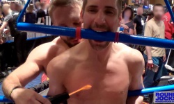 Jarrod Locke is a shy jock who volunteered to get tied up at IML this year for a demo. Coach Dirk Caber has him strung up in no time with his mouth tied to the Tetruss rig via a makeshift pole-gag. Once Jarrod is helplessly restrained, Dirk brings out the violet wand and slowly glances it across the muscled boy’s smooth body. Jarrod groans and moans as the crowd watches the boy suffer under the violet wand.