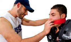 Bound, muscle jock Marc Dylan is tied up in his football uniform. His head is tied to his helmet so he can’t move it from side to side. Knotty Brent seizes the opportunity to make Marc suck his giant dick through the helmet until he is fully satisfied.