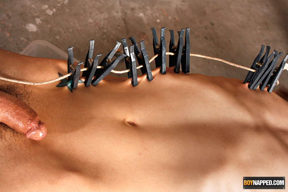 Found naked and roped down to the bench, Connor can hardly fight back as kinky Ashton arrives to play. Enjoying the taste and feel of the boys floppy cock, he gets his pegs out and begins his interesting design. Pegging the boys flesh down his torso, around his balls and back, it's in place ready to be used to inflict the discomfort and pain he likes to dish out. Sucking and wanking the boys cock has him hard and needing a wank too, so he blindfolds his captive and releases his dick to jerk out a load over him. With his cock finally satisfied, Ashton pulls on his little rope...