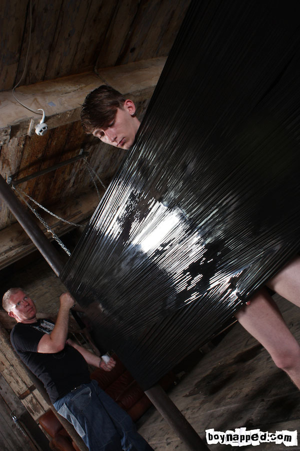 Palet wrap isn't something we have seen on BoyNapped, but sexy Max Brown wears black plastic so well. Wrapped like a piece of meat, Max has but a small hole to breath from as Sebastian pulls his hard dick through a second hole. Balls roped, bucket in place, Sebastian empties over 5 liters of water into the bucket which is held only by Max's stretched balls. With pain and weight on his balls, amazingly, Max is still shoots his creamy load before pleading for his situation to end.