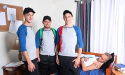 They may have lost the game but not the battle. Bobby, Shane & AJ have arrived back at their dorm room and they see Leo lying next to his laptop. It’s nothing new, but this time they find gay porn on his laptop and just can’t believe it. Once the laughter dies down they decide to rub their cocks all over Leo’s face to see if he will blow them. What they don’t know is that Leo planned all of this and is patiently waiting for cocks in his mouth. The boys move forward with their plan and to their surprise he loves the cock and begins sucking and stroking all 3 of them. Leo has three hard dicks to play with and wants all the loads to be shot across his chest. All four of them make a pact not to tell coach and they proceed to face fuck Leo until they all get fully served.
