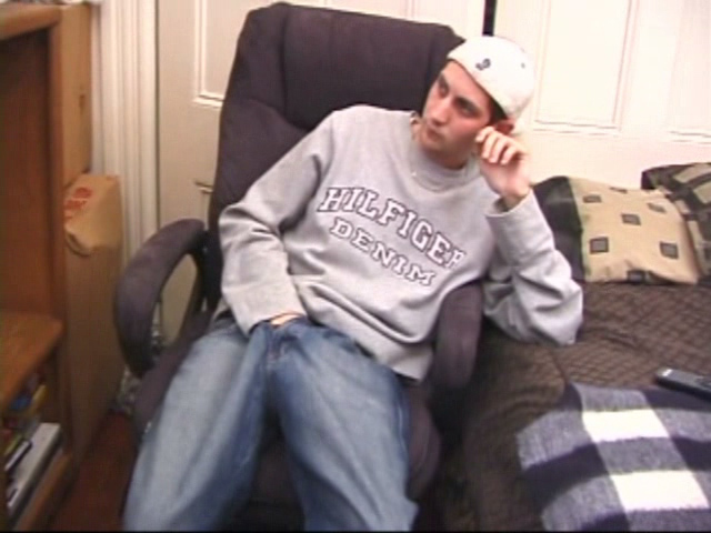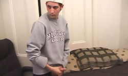 As a porno video plays, Aaron strokes himself hard, and then pulls his cock out of his jeans. After a nice long stroke show, this young man lets loose and spills his warm sticky cum onto the bed.