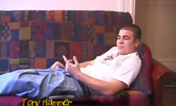 Tony Hammer looks like he was the linebacker on his old high school football team. Watching straight porn, he stands and shows off his chubby from all angles. Then on his back, he grabs his beefy cock and starts stroking. Pounding his meat hard, Tony gets verbal as he works on getting his nut off. He shoots all over his face and torso and well beyond, splattering the couch and the floor.