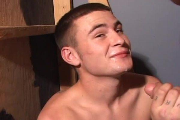 We first find two hot young men in a tight space. One stud on his knees pulls out a nice smooth shaved cock and begins to suck it, getting it nice and hard. It’s clear from the way that he sucks this dick that he knows exactly how to treat a cock, sliding it deep into his throat and keeping it hard. Between sucks he strokes it a bit, up and down with the long dick finally blowing a huge load all over his nice smooth face.