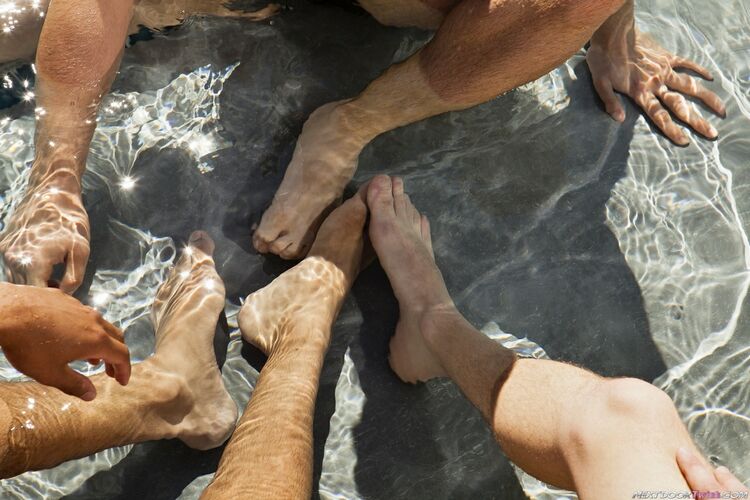 Joey Hard and his friends Jake Farren and Hollis Emery are just enjoying a summer day out by the pool. Just dicking around with the water cannons, the beach ball, swimming around and wrestling in the pool on a beautiful afternoon. Getting a little tuckered out, Jake reclines on a float, his body glistening in the sun. Joey and Hollis both have the same thing on their minds, and they spring their plan into action, each attacking Jakes speedos from the opposite side. In no time they have Jake’s skivvies down around his ankles and they are taking turns sucking his sun drenched cock. Moving this pool party out to the deck, they resume their quest for summer cock as now Jake and Hollis prey on Joey’s meatstick. But as good as this double blow job feels, Joey is trying to get fucked, and it is way too hot out here, so the three of them move into the bedroom for a good and proper threesome. Once inside, Joey assumes the position and Jake pushes his cock into Joey’s waiting hole while Hollis stuffs Joey’s mouth from the other side. Joey is taking it like a true cock pig and loving every minute of it. As Jake pumps him missionary, Joey strokes his cock and cums all over himself as Jake and Hollis both spray him down with their jizz-hoses. Luckily Joey’s got a towel nearby.