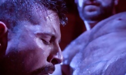 Spencer Reed straddles his motorcycle, jacking off, in a secret place surrounded by rough wood slats and corrugated siding. He thinks he's alone, but there's another tribute to manhood, Kyle King, watching from a distance. The siding reflects the light as shiny and unyielding as the spit covered cocks of the two bearded men eying each other. Kyle knows he's going to give it up to this rough-looking, meaty man with the almost frighteningly hard cock. Spencer pushes Kyle's head onto his cock with such rude strength that lips bash into groin again and again. The ramming tool rattles deep in Kyle's throat. He pulls off only to slaver more spit on Spencer's massive pole. Kyle wants it real slick when Spencer shoves it brutally up his ass. Kyle's never been so ferocious in his demand to be fucked, and Spencer takes every advantage. Spencer's broad highway of a cock stretches Kyle's ass as wide as a tunnel through a mountain and you'll be amazed to see it staying open when Reed pulls out. Only to plunge deep and hard back inside, jabbing and grinding until the guy's engines are so overheated their hot cum sprays across their bodies.