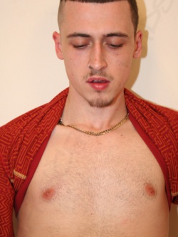 Alex came up from London for this shoot, his first for UK Scally Lads. This horny scally lad wore Reebok Classics, shiny black Puma trackie bottoms, navy blue Nike jacket, red sweat top and blue Adidas cap. He had an unusual request when we got to my place - he wanted his arse hair trimmed with some clippers. This job does have some perks! Alex didn’t need any porn to get himself hard and we started the shoot in his full scally gear. He began feeling down his trackies and he used spit to rub into his impressive 7-inch cock and his nipples. Gradually items of clothing came off to reveal a slim toned body. Alex was very natural in front of the camera and clearly loved showing off his body. He wanked off, fingered himself, played with his arse and chilled out by smoking whilst he pleasured himself.