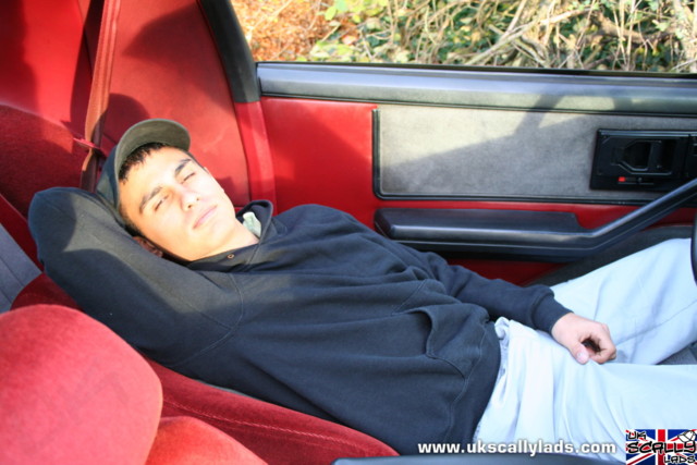 Tristan is an experienced model who has appeared in quite a few websites over the past couple of years. He's a confident, cocky, chatty lad who knows what he wants. He arrived at my place in this huge red Pontiac Firebird sports car with monster noise coming from its 5-litre V8 engine! Goodness knows what the neighbours thought! I was initially going to do shoot indoors, especially as it was chilly outside, but Tristan suggested we go somewhere outdoors and do the shoot in and out of the car. What an inspired suggestion it was. Having found a remote side road nearby I took a couple of shots of Tristan with his pride and joy and then he got into the car and starting playing with himself and teasing the camera! Tristan wanked off with his trackie bottoms still on - after all it was cold! But soon he pulled his pants and his boxers down to reveal is thick 7.5 inch uncut dick, which he continued to caress whist lying back with seat fully reclined.