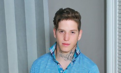 Mishka is as hard as a rock, and he eases into a more comfortable position. He liberally applies the lube, often, so that his big cock is glistening and the sound of his hand rubbing up and down his shaft is smooth and steady. As he jerks off, Mishka continues to peek over into the camera with his puppy dog eyes, and he rubs his chest before running his fingers through his hair. Once he has stroked long enough, the pace quickens. He furiously beats his dick until he spurts out a nice load of creamy, warm cum all over his hand and stomach. Breathing a sigh of relief, Mishka has the look of a quite contented 20 year old. Hot solo!
