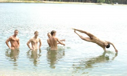 Rado Smutny, Mattias Soslich, Anton Malac, Mirek Hodbod and Patrik Lukasz make a fabulous line-up for our latest Wank Party. We join the five of them as they are at the beach enjoying a leisurely game of volleyball. All are naked as they play, Mattias and Rado against Patrik, Mirek and Anton. They aren't taking the game too seriously and, after a while, they leave it and have a little play on a roundabout. As they spin round and round the camera is at groin level and we see the cock and balls of each guy going through the frame. Then they climb onto the roundabout and their asses are in full view. Next it is time to get into the lake, and the 5 guys run down to the water, dicks flapping around as they do. They swim out a bit, into the lake and begin to play with Mattias and Rado lifting the others, in turn, and tossing them as far as they can into the water. Having enjoyed themselves for long enough with their play they move inside to continue the fun. Mattias takes charge and begins to train the guys. firstly making them bend over to touch their toes. Mattias spanks each of them on the ass in turn and tells them to get naked. They do as they are told and bend over again, with those beautiful asses in full view. When they stand up, as ordered, and turn around each of them is fully erect.